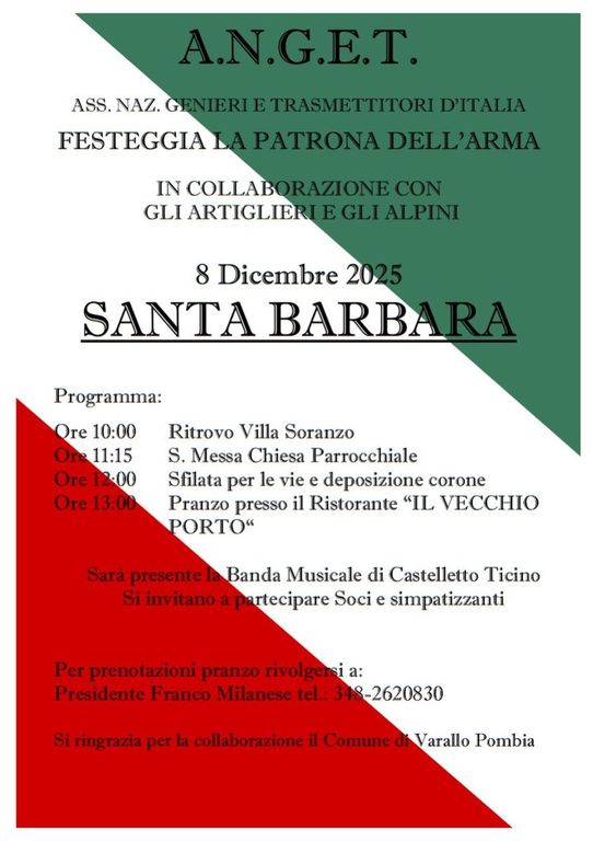 L’8 dicembre 2025 Varallo Pombia si prepara a celebrare Santa Barbara, patrona dell’Arma dei Genieri e Trasmettitori, con una giornata ricca di momenti solenni e di comunità. L’evento è organizzato da A.N.G.E.T. – Associazione Nazionale Genieri e Trasmettitori d’Italia, in collaborazione con Artiglieri e Alpini, con il supporto del Comune di Varallo Pombia.