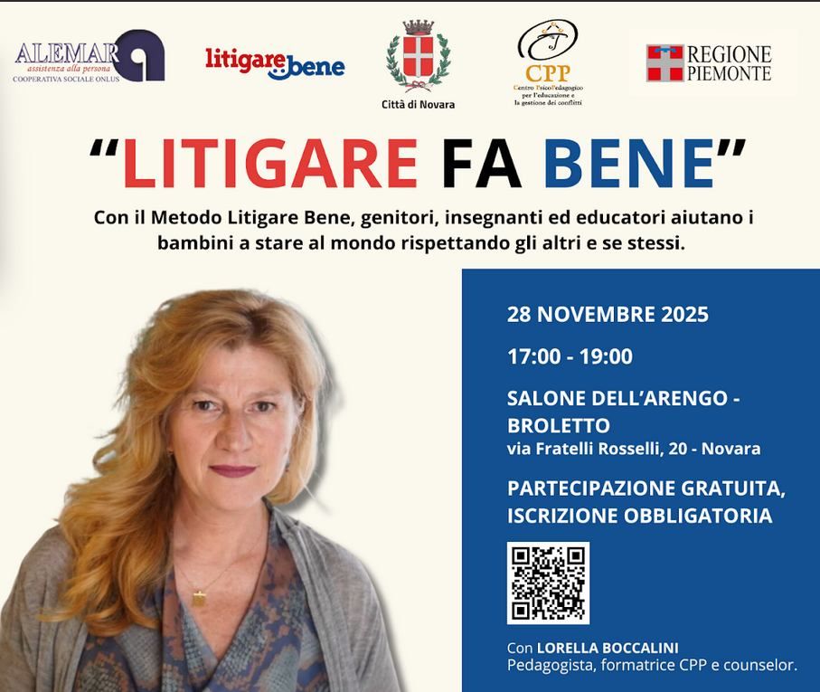 Un pomeriggio dedicato alla crescita dei bambini attraverso la comprensione e la gestione dei conflitti. È l’obiettivo del convegno “Litigare fa bene”, promosso dall’assessorato alle Politiche Educative del Comune di Novara insieme al Coordinamento Pedagogico Territoriale, in programma venerdì 28 novembre 2025, dalle 17 alle 19, nel Salone dell’Arengo del Broletto (via Fratelli Rosselli 20).