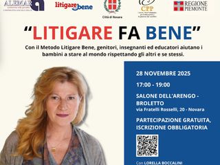 Un pomeriggio dedicato alla crescita dei bambini attraverso la comprensione e la gestione dei conflitti. È l’obiettivo del convegno “Litigare fa bene”, promosso dall’assessorato alle Politiche Educative del Comune di Novara insieme al Coordinamento Pedagogico Territoriale, in programma venerdì 28 novembre 2025, dalle 17 alle 19, nel Salone dell’Arengo del Broletto (via Fratelli Rosselli 20).