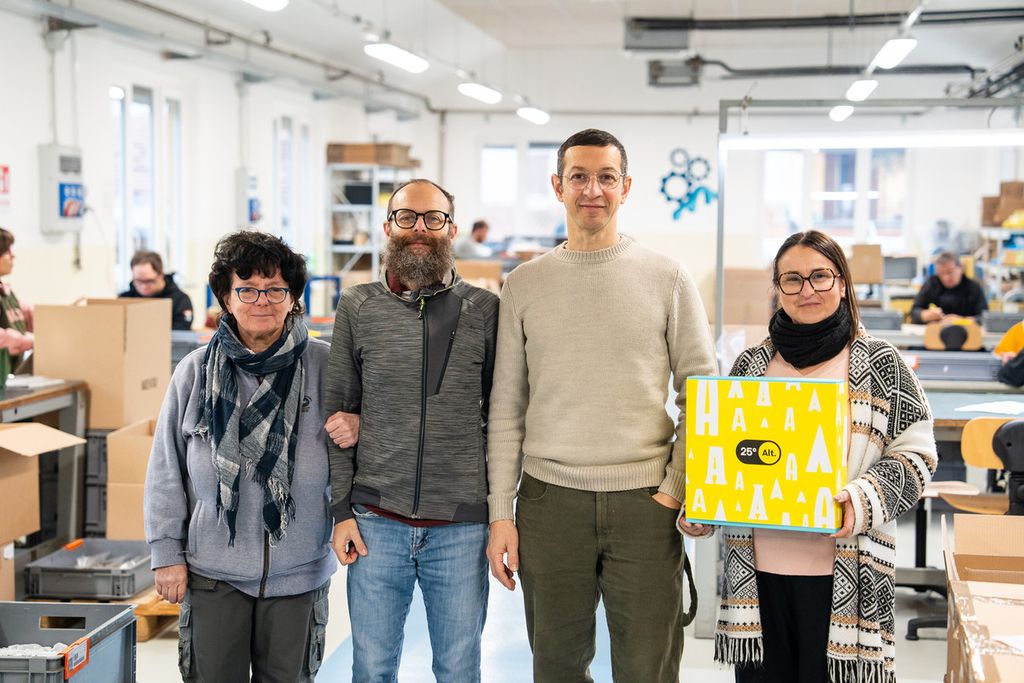 La confezione, personalizzata e brandizzata Alt., contiene anche uno scritto dedicato. Una volta definito il contenuto del dono, è nata l’esigenza di esternalizzare il lavoro di confezionamento e spedizione. «A quel punto – prosegue la nota – abbiamo pensato di affidarci a una realtà del territorio che spiccasse per motivi etici, a cui noi abbiamo sempre dato importanza, e, al tempo stesso, di poter dare una mano a loro».