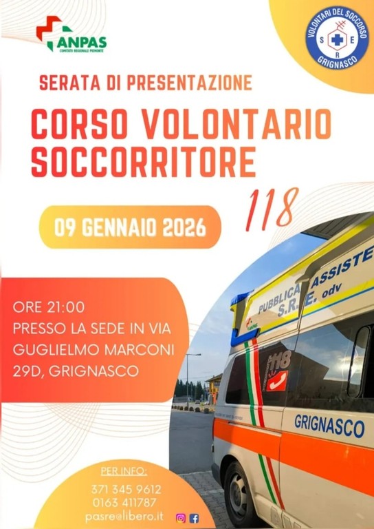 La Pubblica Assistenza Anpas, Sre Servizio Radio Emergenza di Grignasco annuncia l’avvio del nuovo corso gratuito per volontari soccorritori e soccorritrici, con una serata di presentazione in programma venerdì 9 gennaio 2026 alle ore 21 presso la sede dell’associazione, in via Marconi 29D a Grignasco. L’invito è rivolto a tutte le persone maggiorenni interessate ad apprendere le tecniche di primo soccorso e a mettere a disposizione parte del proprio tempo per un impegno di volontariato a favore della comunità.