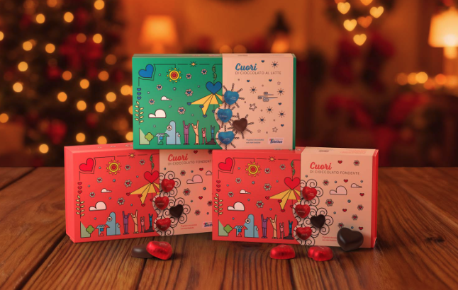 I Cuori di cioccolato, ideali come regalo di Natale, sono disponibili nei gusti fondente e al latte e confezionati in scatole scrigno con chiusura magnetica, rispettivamente nei colori rosso e verde. Ogni confezione contiene 15 cioccolatini a forma di cuore, ciascuno con una mini-dedica che trasmette affetto, speranza e impegno.