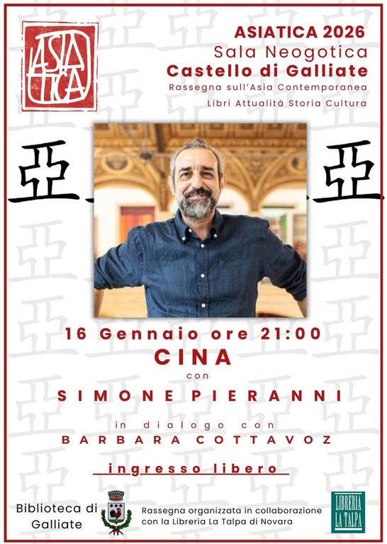 Venerdì 16 gennaio alle ore 21, nella Sala Neogotica del Castello Sforzesco di Novara, prende il via il ciclo di incontri "Asiatica", organizzato dall’Assessorato alla Cultura in collaborazione con la Biblioteca e la libreria La Talpa, nell’ambito della rassegna "Il mondo attuale".