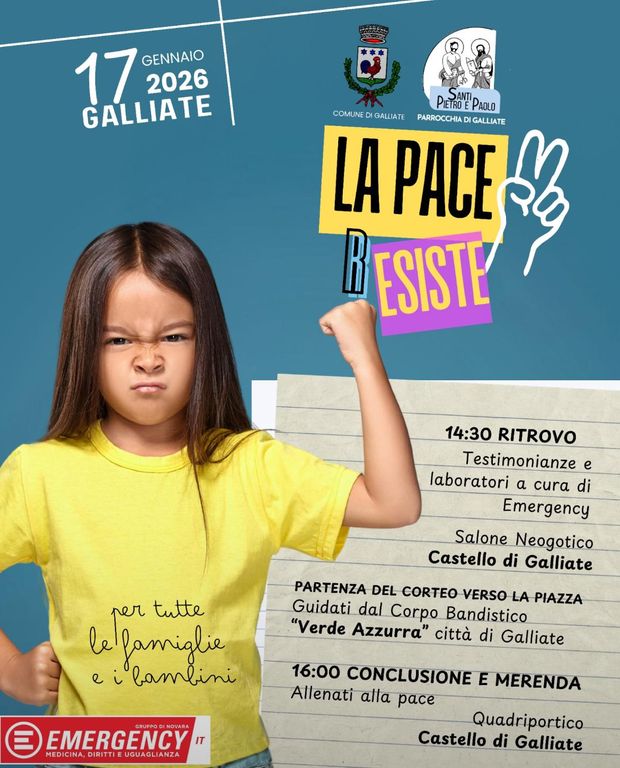 Un pomeriggio all’insegna della pace e della condivisione quello in programma sabato 17 gennaio alle 14.30 nella Sala Neogotica del Castello di Galliate. L’iniziativa, realizzata in collaborazione con la Parrocchia, vedrà protagonisti famiglie e bambini in laboratori e attività ludiche, mentre nelle sale sud del Castello è previsto un momento di riflessione dedicato agli adulti, con testimonianze di Emergency.