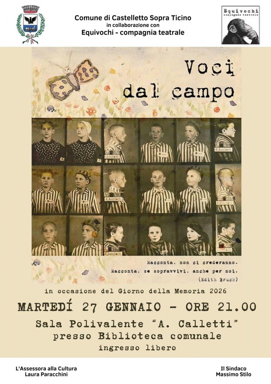 Un momento di riflessione profonda, affidato alla forza della parola e del teatro. In occasione del Giorno della Memoria, il Comune di Castelletto Ticino propone lo spettacolo “Voci dal campo”, in programma martedì 27 gennaio alle 21 nella sala polivalente della biblioteca comunale. L’ingresso è gratuito.