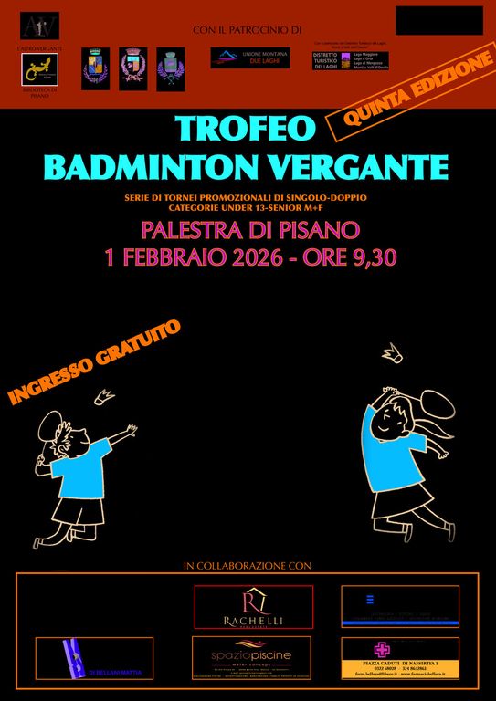 Domenica 1 febbraio, presso la palestra di Pisano, prende il via la prima prova di doppio della quinta edizione del Trofeo Badminton Vergante. L’iniziativa, sostenuta dal patrocinio di istituzioni, comuni e associazioni locali, può contare anche sul contributo degli sponsor storici, amici appassionati dello sport e del territorio.