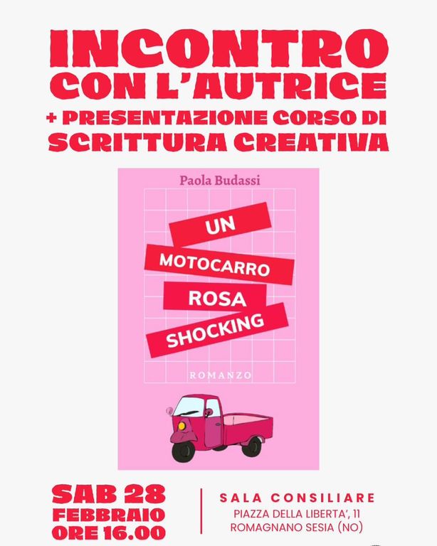 Un pomeriggio dedicato ai libri, alle storie e alla creatività. Oggi, sabato 28 febbraio alle ore 16, la Sala Consiliare del Comune di Romagnano Sesia ospiterà l’incontro con l’autrice Paola Budassi, che presenterà il suo ultimo libro, Un motocarro rosa shocking.
