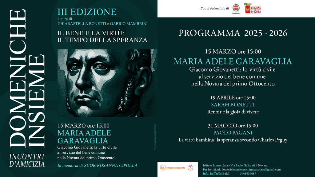 Al centro dell’appuntamento ci sarà la figura di Giacomo Giovanetti, protagonista della storia novarese del primo Ottocento, attraverso la conferenza dal titolo “Giacomo Giovanetti: la virtù civile al servizio del bene comune nella Novara del primo Ottocento”. A guidare l’approfondimento sarà la relatrice Maria Adele Garavaglia.
