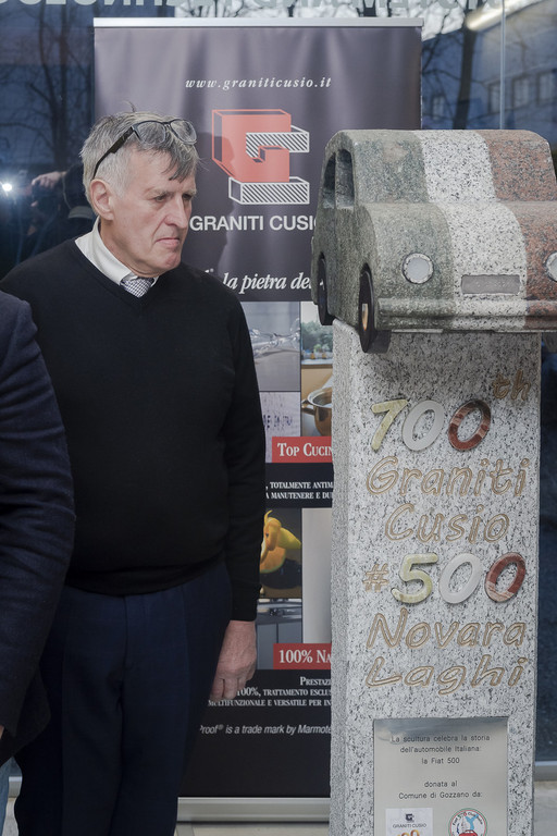 Il momento centrale della celebrazione è stato lo svelamento dell’opera destinata al parco comunale di Gozzano. Il monumento, nato dalla collaborazione con Marco Leonardi, presidente dell’Associazione Fiat 500 Novara Laghi unisce due icone del saper fare italiano: il granito, materia eterna, e la 500 d’epoca, simbolo intramontabile di ingegno e movimento di un intero paese.
