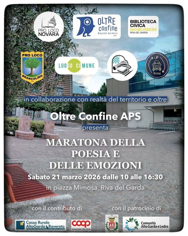 Buona partecipazione ed emozione a Riva del Garda per la prima edizione della “Maratona Poetica delle Emozioni”, organizzata il 21 marzo in occasione della Giornata Internazionale della Poesia. L’iniziativa, promossa da Oltre Confine in collaborazione con Pro Loco Novara, rappresenta il quinto appuntamento di un percorso culturale che continua a crescere anche oltre i confini territoriali.