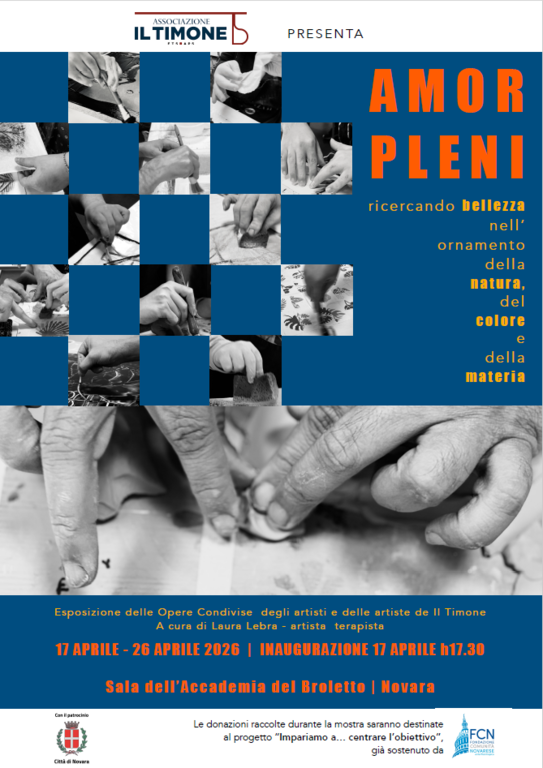 L’Associazione Il Timone di Novara presenta “Amor Pleni, ricercando bellezza nell’ornamento della natura, del colore e della materia”, una mostra collettiva nata dal percorso di Terapeutica Artistica che ha coinvolto ragazzi e ragazze con disabilità cognitiva, guidati dall’artista terapista Laura Lebra.