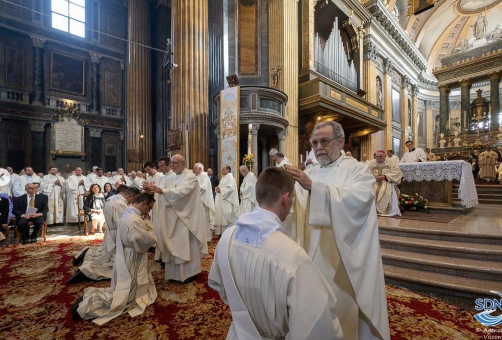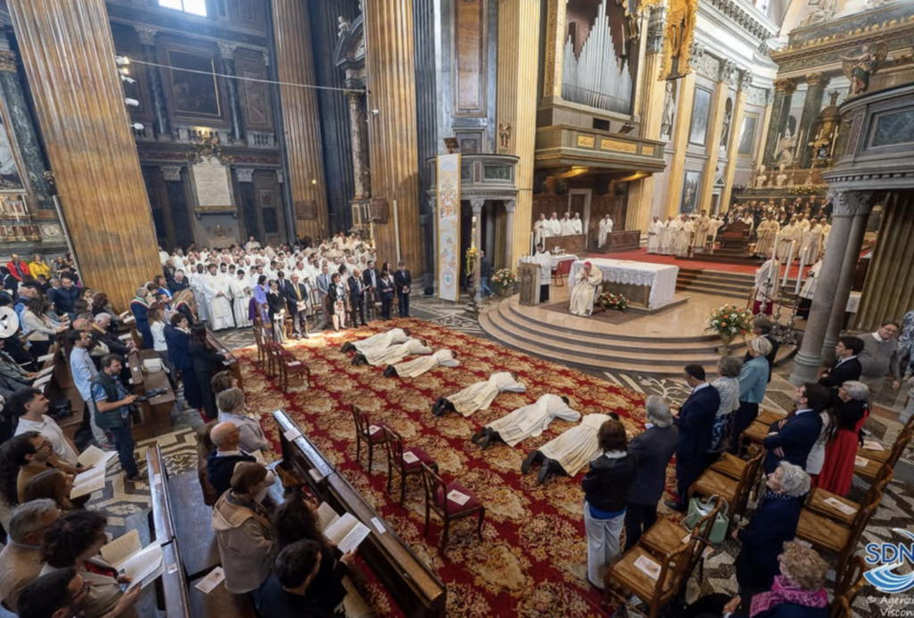 “L’antichissimo canto del Preconio, che risale sino al IV secolo, affiora sulle nostre labbra e sgorga dal nostro cuore in questa solennissima celebrazione in cui sei nostri fratelli, chiamati dal popolo di Dio, sono ordinati presbiteri della santa Chiesa di Novara- le parole del vescovo Brambilla all’inizio dell’omelia -. Veramente gioisce la Madre Chiesa, con il vescovo, i sacerdoti e tutto la turba dei credenti, perché il dono di Dio rallegra la faccia della nostra terra che si distende dal riso al Rosa. La parola di Dio, scelta da voi candidati, racconta l’apparizione del Risorto agli apostoli secondo il vangelo di Giovanni. Essa contiene cinque momenti che possono illuminare il vostro cammino come un bagliore che attraverserà tutta la vostra vita”.